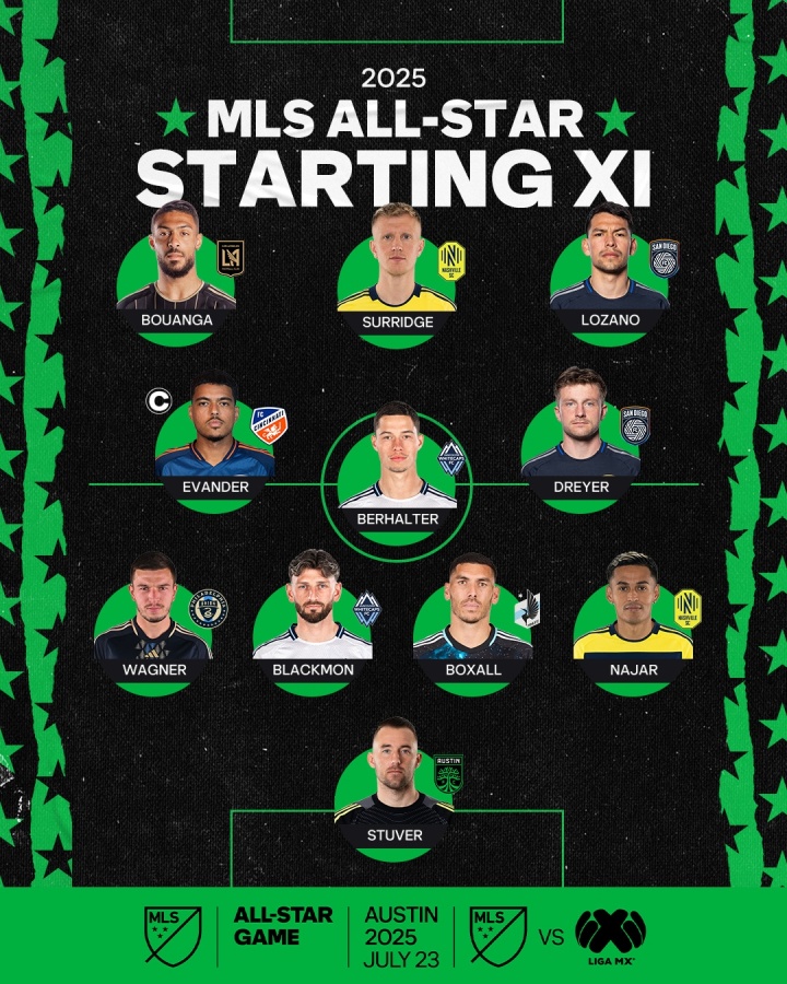 美职联全明星首发:1-斯图弗、31-安迪-纳亚尔、15-伯克萨尔、33-布莱克蒙、28-凯-瓦格纳、7-德雷尔、16-塞巴斯蒂安、19-埃万德、11-洛萨诺、98-苏里奇、99-博安加