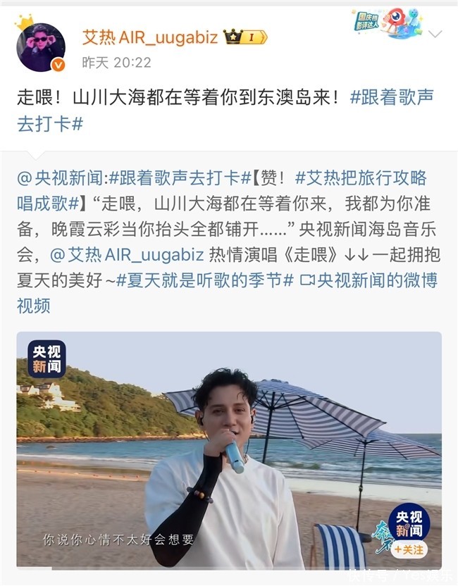 7月26日,种梦音乐D.M.G艺人艾热AIR亮相央视新闻直播间,在央视新闻《跟着歌声去打卡》联合广东文旅推出的「奔赴山海 不负热爱」海岛音乐会上鑫创国际,演绎备受喜爱的歌曲《走喂》《别怕变老》,唱响仲夏夜的东澳岛。落日时分,在山环水抱的开阔海岸,在艾热轻松愉悦、温柔浪漫的歌声里,潮汐与旋律同起伏,暮光与情感共辉映,诠释生活中的美好与热爱。央视新闻发布后,《走喂》成为继《千里万里》后又一爆火文旅BGM,出现在浙江舟山、贵州遵义、内蒙古等地官方视频号的文旅宣传片中,美轮美奂的人文风光搭配轻盈洒脱、解压治愈的音乐,带来令人沉醉的视听享受。